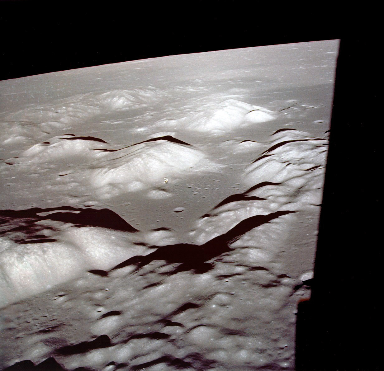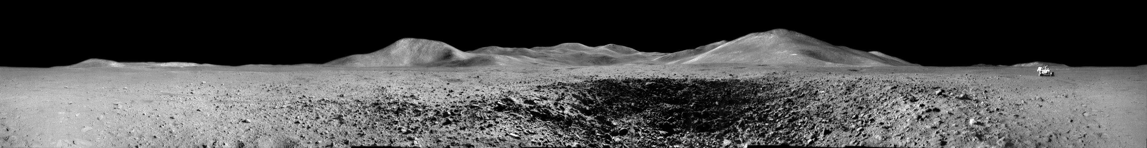 View of the last Apollo landing site in the Taurus Littrow valley, taken from the Apollo 17 lunar module. The exact landing site was in the middle of the valley, just right of the distant command module in this picture.