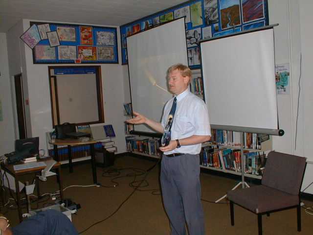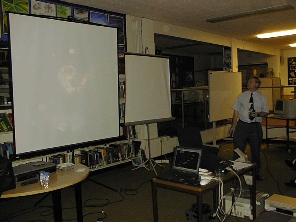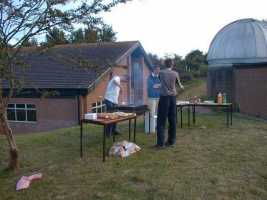 The lecture programme commenced at mid-day with a fascinating and humorous explanation of what it's like to be "At Home in Space" presented by our special guest David Shayler. David is a prolific space and astronomy author, including titles such as "Disasters and Accidents in Manned Space Flights", "Gemini - Steps to the Moon" and "Skylab - America's Space Station". He also co-authored with Rex Hall on "The Rocket Men - Vostok & Voskhod, The First Soviet Manned Spaceflights". The next two talks (either side of lunch) were by TAS chairman David Norman. The first examined some of the amazingingly detailed images from the new advanced camera on board the Hubble Space Telescope. The second looked at the techniques used to detect 'extrasolar' planets (those around stars other than our Sun). Dave presents a monthly spot covering spaceflight and astronomical events on BBC Radio Devon. The next talk was by John Parratt of North Devon Astronomical Society. John covered the past history of the North Devon AS and looked forward to its future plans for a major new observatory. This was followed by a presentation from Exeter Astronomical Society on their successful use of video cameras to capture dynamic astronomical events such as lunar occultations. After a break for tea our second major talk of the day was presented by astronomical writer Paul Money. Paul was here at the school for the 1999 eclipse and has written many articles for the astronomical press (including one featured recently in "Astronomy Now" on his completing a full Messier Marathon down at COAA in Portugal). The wide-ranging subject of Paul's talk was "The Wonders of the Universe!", and took us on an illustrated tour from the viewpoint of a photon of light travelling from the farthest reachs of the universe to the Earth. To finish off the lecture programme and prepare us for our evening of observations, Dr Chris Proctor (TAS Observations Secretary) did a talk on 'The Night Sky'. Chris has done a lot of excellent work with both conventional film photography and CCD imaging over the years. Many of these images feature in the gallery section of the TAS web-site at http://torbayastro.org.uk. At 7pm the barbeque got under way. As last year, this proved a great social success with a number of family guests visiting us for the evening session. At 8pm the excitement really began with the rocket launching event! Several rockets were brought along from the school, members of the society and visitors. In fact, we had two launch pads set up and were still pushed to get all the rockets launched while the light lasted! Everybody loved this and all present helped with the countdowns! Finally, the observatory was opened up and observations of the moon and other night-sky objects began. We were also presented with the possibility of seeing a close fly by of a near-Earth asteroid (2002 NY40) during the night and early hours of Sunday morning. Our second AstroWest went very well, with much better weather than last year. Once again the campers all said how much they enjoyed the weekend and wanted to come back next year. Here's looking forward to AstroWest 2003! |