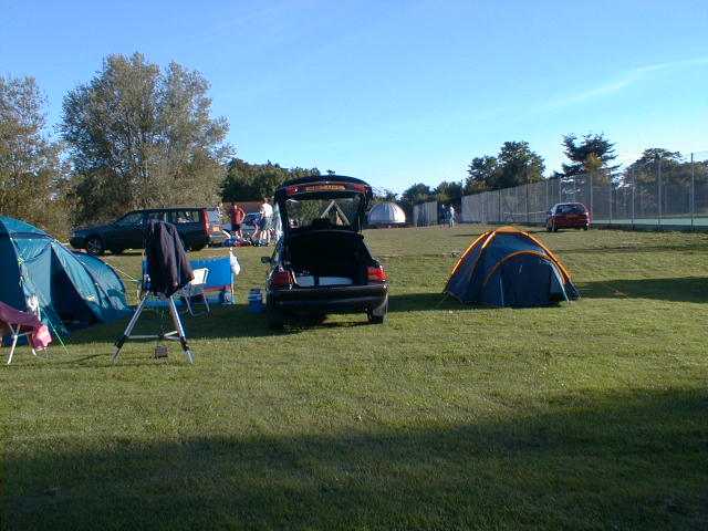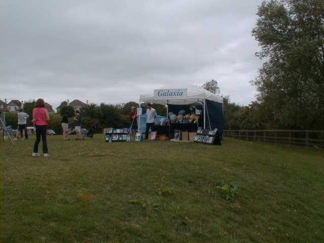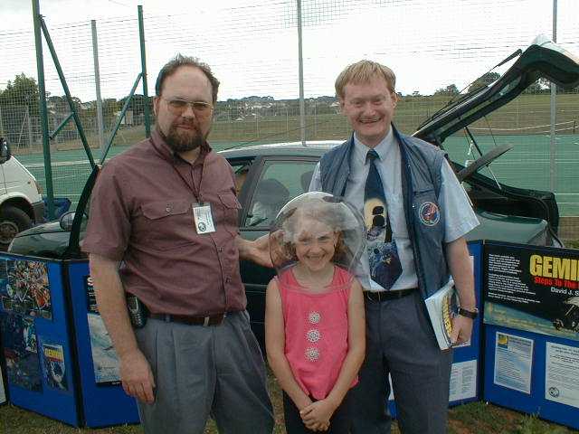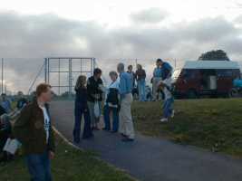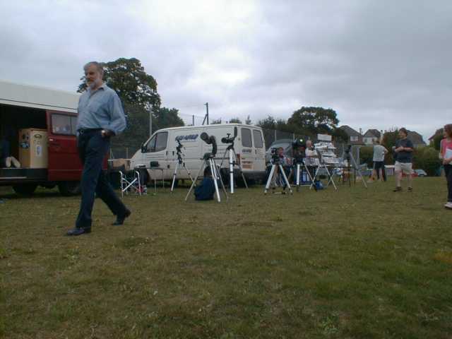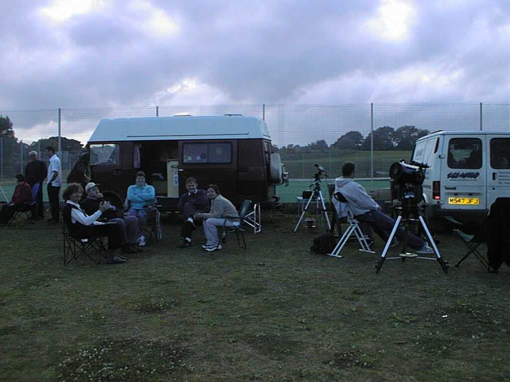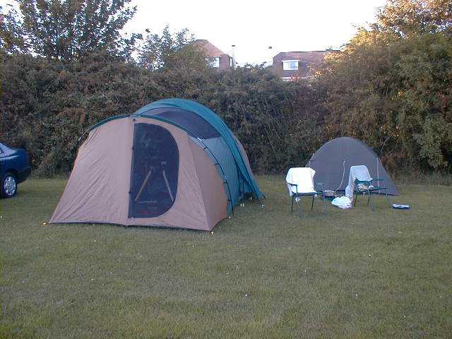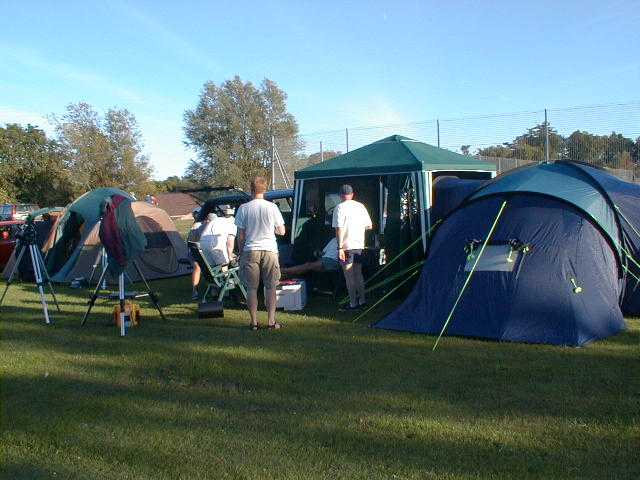 The 2002 astro-campThis year a third night of camping was added to last year's two. Many of our 'astro-campers' come a long way to visit AstroWest so the extra night was widely welcomed (and likely to be added to further next year).Grahame Veale (Torbay AS vice-chairman and Head of Science at the Torquay Boys' Grammar School) arrived early on the first day (Thursday) to open up all the kitchen, shower and toilet facilities. As an event organiser and principal contact for the astro-camp, Grahame was soon welcoming a steady flow of arrivals from around the country. The first night of observational activity was particularly successful once the first quarter moon had set. The cool and calm air across the main school field was soon host to a wide range of astronomical instruments. The school's 19-inch reflector peered into the dark sky and some very impressive equipment brought to the site by the campers was in full action. Altogether, a scene of peaceful contemplation of the heavens interrupted only by the occasional whirring of a 'goto' scope seeking its next target. The second (Friday) evening saw the arrival of Dave Norman (chairman of event hosts, Torbay Astronomical Society) along with fellow event organisers John Parratt (with his younger daughter, Stacey) and Kieron McGrath, owner of major south-west dealer SCS Astro. As he did last year, Kieron once again arrived in a van-full of telescopes and other exciting astronomical gadgets and goodies! (click on any image to see the full version) The Public Open DayThe campers awoke Saturday morning to the sound of the local seagulls on another pleasant day ...The day's programme officially commenced at 11am with the opening of the trade exhibition. These included Kieron McGrath of SCS Astro, displaying a wide range of telescopes for visitors to buy and look at.