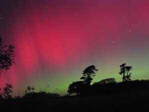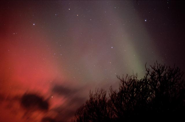 AURORA over TORBAY on October 21st, 2001The spectacular auroral images below (click to see large scale) were taken by society member Martin Bastion on the evening of Sunday 21st October, 2001 from the lanes near Nortel / Whiterock, between 9.30 and 10pm. Exposures vary between 8 and 16 seconds, F1.8, with the camera set to 400 ISO. The first two show the aurora with (left, part of) the Plough visible in the background (double star Mizar and Alcor clearly visible in the Plough's handle) and the third is set against Hercules, Corona Borealis and Bootes.The reds and greens are mainly due to excited oxygen atoms. The display was initially caused by the eruption of the first of two category X1.6 solar flares from sunspot number 9661 at 0105UT on October 19th. This sent a coronal mass ejection (CME) in the direction of the earth, reaching the Earth's magnetosphere at 1650UT on October 21st.