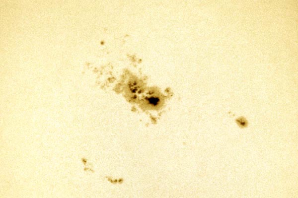 The Sun on 27th April 2000, photographed at the TBGS Observatory with the 15 cm reflector and a Baader film full aperture solar filter. Two very large bipolar sunspots are present, surrounded by a scatter of smaller spots. The two big spots could be seen with no more optical aid than a pair of "eclipse glasses" to cut the intensity of the Sun's light down to safe levels. Many more large spots like these should be visible over the next year or so of solar maximum. |