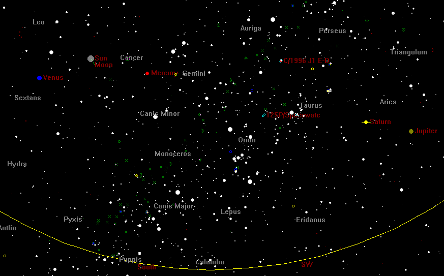 | Here's how the sky looked (schematically, at least!). The eclipsed sun was roughly 47 degrees above the horizon at a bearing of 133 degrees from true North. Venus, at around magnitude -4, was a brilliant object below and to the left of the sun/moon. Mercury (magnitude 0.7) was visible slightly above and to the right of the sun/moon. Low above the Western horizon Jupiter (magnitude -2.1) was another bright object, with Saturn (magnitude 0.1) above and to the left. The 'winter' constellation of Orion was prominent slightly West of South. |