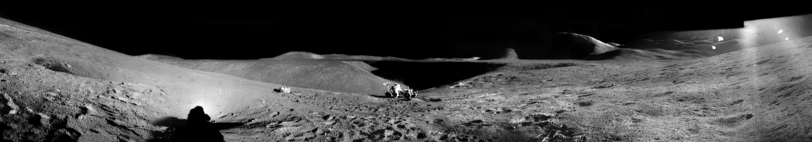 Above is a 180 degree pan of Apollo 15 station 2, assembled from a series of photos. It shows the view from the lower slopes of Mount Hadley Delta. The valley in the middle of the panorama is Hadley Rille, an ancient lava channel. The rille is about a mile wide - much bigger than it looks. Also prominent to the right are the hills of the Swann Range and the bulk of Mount Hadley, mostly in shadow.