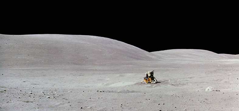 View of the last Apollo landing site in the Taurus Littrow valley, taken from the Apollo 17 lunar module. The exact landing site was in the middle of the valley, just right of the distant command module in this picture.