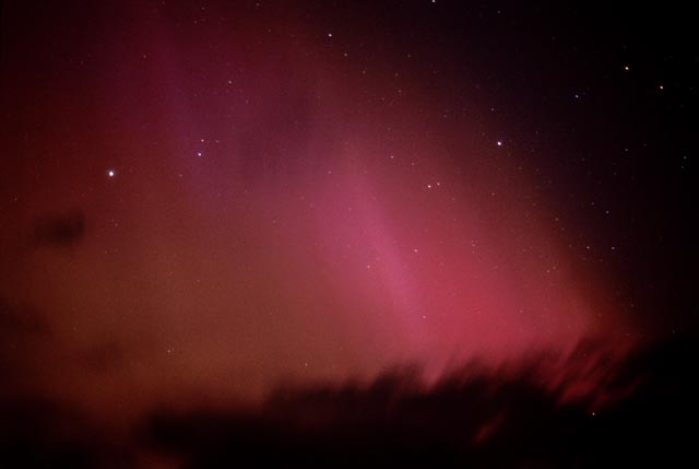 AURORA over TORBAY on October 21st, 2001The spectacular auroral images below (click to see large scale) were taken by society member Martin Bastion on the evening of Sunday 21st October, 2001 from the lanes near Nortel / Whiterock, between 9.30 and 10pm. Exposures vary between 8 and 16 seconds, F1.8, with the camera set to 400 ISO. The first two show the aurora with (left, part of) the Plough visible in the background (double star Mizar and Alcor clearly visible in the Plough's handle) and the third is set against Hercules, Corona Borealis and Bootes.The reds and greens are mainly due to excited oxygen atoms. The display was initially caused by the eruption of the first of two category X1.6 solar flares from sunspot number 9661 at 0105UT on October 19th. This sent a coronal mass ejection (CME) in the direction of the earth, reaching the Earth's magnetosphere at 1650UT on October 21st.