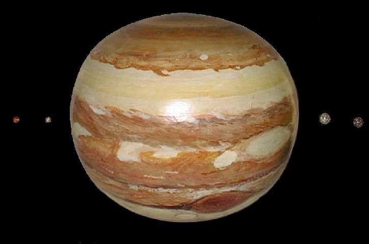 Models of Jupiter and (left to right) the Galilean Moons: Io, Europa, Ganymede and Callisto.