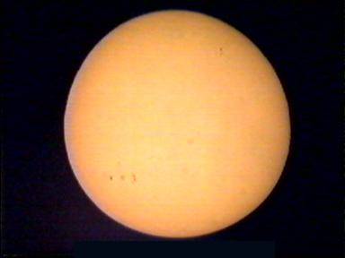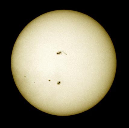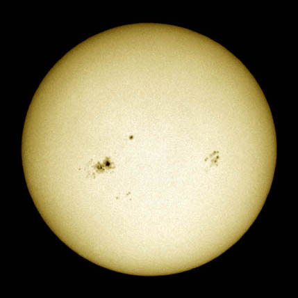 The Sun on 27th April 2000, photographed at the TBGS Observatory with the 15 cm reflector and a Baader film full aperture solar filter. Two very large bipolar sunspots are present, surrounded by a scatter of smaller spots. The two big spots could be seen with no more optical aid than a pair of "eclipse glasses" to cut the intensity of the Sun's light down to safe levels. Many more large spots like these should be visible over the next year or so of solar maximum. |